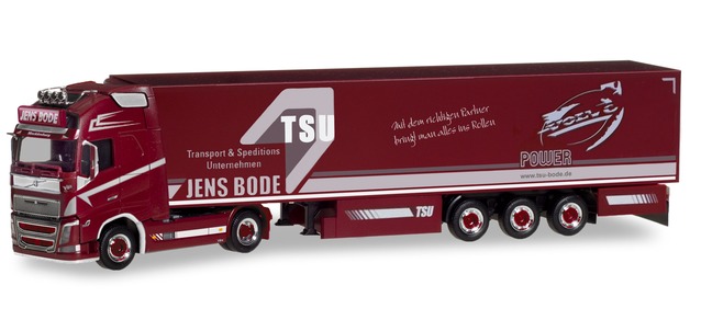 "Ein Exot im TSU-Bode-Fuhrpark stellt dieser Volvo FH dar, den Jens Bode auch auf Wunsch des Fahrers angeschafft hat. Das Modell wird durch den Leuchtkasten, einen Lampenbügel und sehr detailreicher Bedruckung ein Highlight."