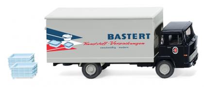 "Fahrerhaus und Grillblende schwarzblau. Fahrgestell mit Kardanteil schwarzblau, Felgen papyrusweiß. Inneneinrichtung fenstergrau. Koffer mit Kofferdach und Kotflügeln papyrusweiß. Ladebordwand ebenfalls. Fahrerhaus mit gesilbertem Magirus-Logo vorn sowie seitlichem „Bastert“-Logo in weiß und rot. Türgriffe gesilbert. Kühlergrill mit papyrusweißer Stegbedruckung. Beidseitige Kofferbedruckung mit Schriftzug „Bastert Kunststoffverpackungen“ sowie Firmengrafik. Frontscheinwerfer per Hand gesilbert. Sechs weißblaue Kisten im Zubehörbeutel beiliegend."