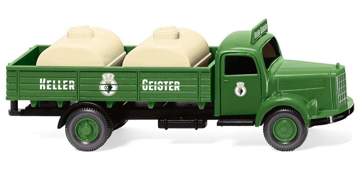 "Fahrerhaus mit Dachschild und Pritsche grasgrün, Tankober- und –unterteil elfenbeinbeige. Fahrgestell mit Kardanteil schwarz, Felgen grasgrün. Verglasung topaz getönt. Frontscheinwerfer und Kühlergrillstege gesilbert, Stoßstange schwarz bedruckt. Fahrerhaustüren mit Logo von „Keller Geister“ weiß, gold und schwarz bedruckt. Dachschild sowie Pritschenseiten und Pritschenheck mit weißen „Keller Geister“-Schriftzug."