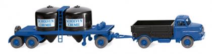 "Zugmaschine mit blauem Fahrerhaus, Fahrgestell, Kardanteil sowie Kotflügeln und Felgen. Pritsche schwarzblau, Sattelplatte silber. Blinker orange, Lüftungsgitter silber. Inneneinrichtung eisengrau. Scheinwerfer per Hand silbern koloriert. Schwarze Kühlergrillfläche mit gesilberten Zierleisten sowie MAN-Schriftzug, Diesel-Lettern sowie Büssing-Logo. Rückleuchten karminrot bedruckt. Anhänger mit Oberteil blau, Aufliegerunterteil schwarzblau. Stützrollen, Leiterteile sowie Leiterhalterung, aber auch Motor, Doppelkotflügel, Achsabdeckung und Drehschemel mit Deichsel und Felgen blau. Seitlich weißblauer Schriftzug Scholven-Chemie auf den Behälterflächen. Heckseitige Rücklichter der Doppelkotflügel verkehrsrot."