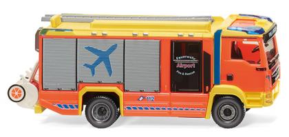 "Fahrerhaus mit Feuerwehraufbau leuchtrot. Inneneinrichtung mit Lenkrad sowie Sonnenblende schwarz. Fanfare zinkgelb eingesteckt. Fahrgestell mit Kardanteil schwarz, Frontschürze mit Kotflügeln und Trittstufen zinkgelb. Aufbauverglasung topas gehalten. Warnlicht blautransparent eingesteckt. Jalousien beidseitig fenstergrau. Heckseitige Leiter silbern eingesteckt. Felgen silbern. Warnlichter blautransparent eingesteckt. Weiße Halterung für Schlauchhaspeln mit zinkgelber Stoßstange. Rote Haspeln eingehängt. Kühlergrill mit silbernem MAN-Schriftzug und –Logo mit Heißfolienprägung. Scheibenwischer und Lufteinlässse sowie Spiegelhalterungen schwarz bedruckt. Sonnenblende mit weißem Schriftzug „Fire & Rescue“. Kühlergrill zusätzlich mit silbern bedruckten Warnblitzern. Frontseitig blauer Feuerwehr-Schriftzug. Fahrzeugzwischenteil blau gehalten. Seitliche Verglasung mit weißem Schriftzug Feuerwehr sowie „Fire & Rescue“. Auf den Rollos blaue Flugzeugkontur sowie auf den Aufbauflanken blaue Warnschraffur und Notruf-Hinweis 112. Seitlich weißer Rosenbauer-Schriftzug auf den Aufbaujalousien. Haspelflanken mit leuchtroter Fläche bedruckt."