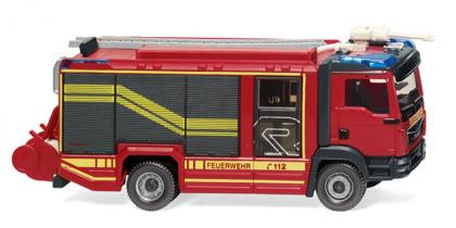 "Fahrerhaus mit Feuerwehraufbau rot. Inneneinrichtung mit Lenkrad sowie Sonnenblende schwarz. Fanfare silbern eingesteckt. Fahrgestell mit Kardanteil, Frontschürze mit Kotflügeln und Trittstufen anthrazitgrau. Hintere Gruppenraumeinrichtung anthrazitgrau. Aufbauverglasung und Pumpenstand topas gehalten. Warnlicht blautransparent eingesteckt. Jalousien beidseitig anthrazitgrau. Heckseitige Leiter silbern eingesteckt. Pumpe heckseitig schwarzgrau angebracht. Halterung für zweifache Schlauchhaspel rot gehalten, Schläuche perlweiß. Felgen silbergrau. Frontseitig leuchtgelber Feuerwehr-Schriftzug an den Fahrerhausseiten, Spiegelhalterung und Zierleisten schwarz. Kühlergrill mit silbernem MAN-Schriftzug und -Logo. Rosenbauer-Logo auf den Türen, seitlicher leuchtgelber Warnschriftzug."