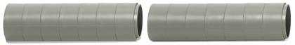 "Sieben Betonröhren mit Standfläche und sieben Betonröhren ohne Standfläche in betongrau."