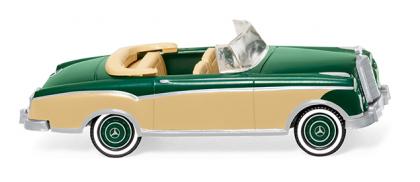 "Dieses Mercedes-Benz Cabrio frohlockte mit Understatement - Wer vom britischen Cabrio-Understatement der fünfziger Jahre schwärmte, der hatte einst noch nicht im Mercedes-Benz 220 S Platz genommen. Im hellen Moosgrün mit beigen Flanken und gleichem Interieur kündete er von Fahrkultur, Freiluftvergnügen und beginnendem Wohlstand seines Besitzers. WIKING hat den Klassiker mit der Cabrio-Eleganz seiner Baujahre aus historischen Formen und nach der Kreation des legendären Modellbaumeisters Alfred Kedzierski revitalisiert und mit einer neuen Inneneinrichtung zeitgenössisch veredelt. Damit kommt die Ästhetik automobiler Nachkriegsgeschichte im 1:87-Programm modellbauerisch detailreich zur Geltung. Der Mercedes-Benz blieb ein automobiles Denkmal – im Modell und Original. Als dann 1960 die Produktion des 220er Cabrios endete, ging die Zeit der Pontons auf deutschen Straßen langsam zu Ende."