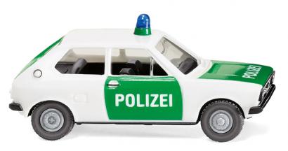 "Karosserie weiß. Inneneinrichtung mit Sitzen und Lenkrad schwarz. Fahrgestell mit Stoßstangen und Kühlergrill schwarz. Frontseitig gesilbertes VW-Logo. Felgen silber. Türen sowie Motorhaube und Kofferraumklappe mintgrün. Schriftzüge „Polizei“ weiß. Rücklichter rot, Blinker orange bedruckt. Rückfahrscheinwerfer silbern. Frontseitige Blinker auf der Stoßstange orange bedruckt. Fenstergummis schwarz, Türschlösser gesilbert."