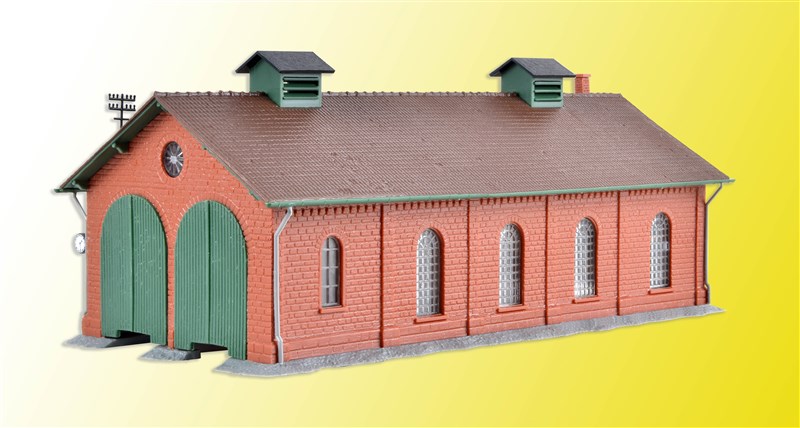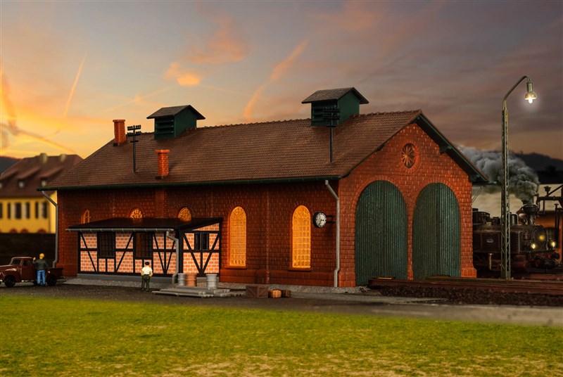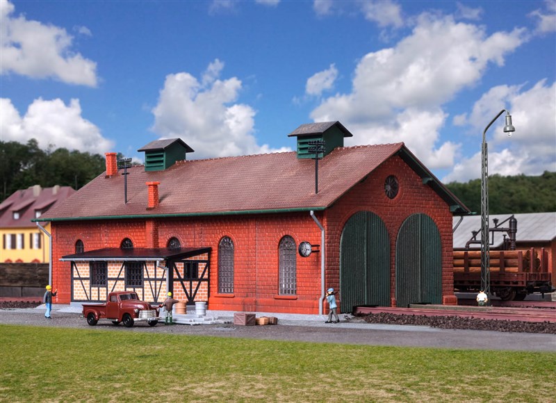 Lokschuppen in Backsteinbauweise mit kleinem Fachwerkanbau.
