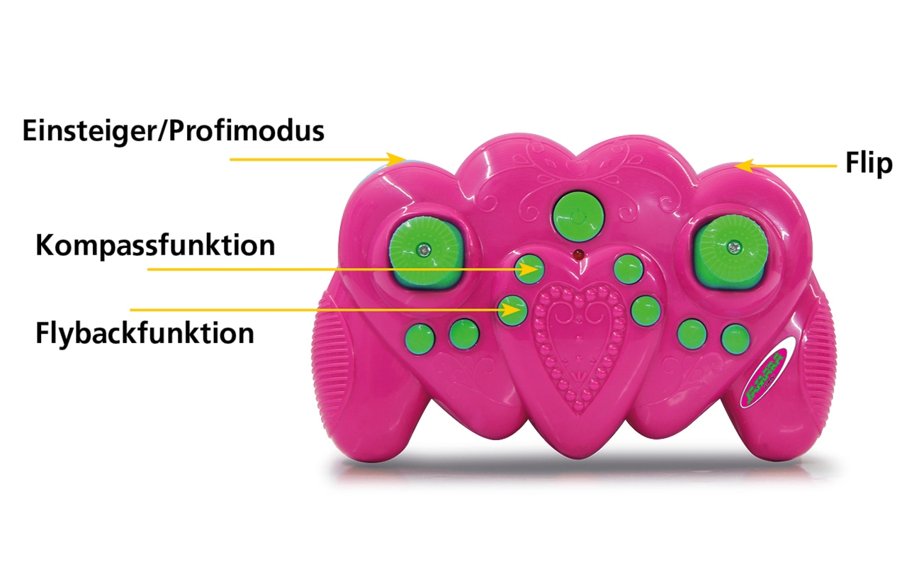 "Neu und einzigartig im Design bringt JAMARA die Quadrella - ein Traum in Pink - als exklusive Neuheit mit zur Spielwarenmesse 2016. Die Märchenprinzessin fliegt als liebevoll gestaltete AHP+ 2,4 GHz Quadrocopter in die heimischen Wohnzimmer und in die Herzen der kleinen Pilotinnen. Der erste Mädchenquadrocopter von JAMARA hat tolle Flugeigenschaften, die auch für Fluganfänger leicht zu erlernen sind. Der Quadrocopter verfügt über eine elektronische Kompass- und Flybackfunktion und kann mühelos 360° Grad Flip-Salto in alle Richtungen ausführen. Die Turbofunktion ermöglicht Geschwindigkeiten bis zu 40 km/h. Vier kraftvolle, durchzugsstarke Motoren, 6-Achsen Fluglagenkontrolle und LED Beleuchtung mit Unterspannungswarnung, sind nur einige Highlights des Märchenfliegers."