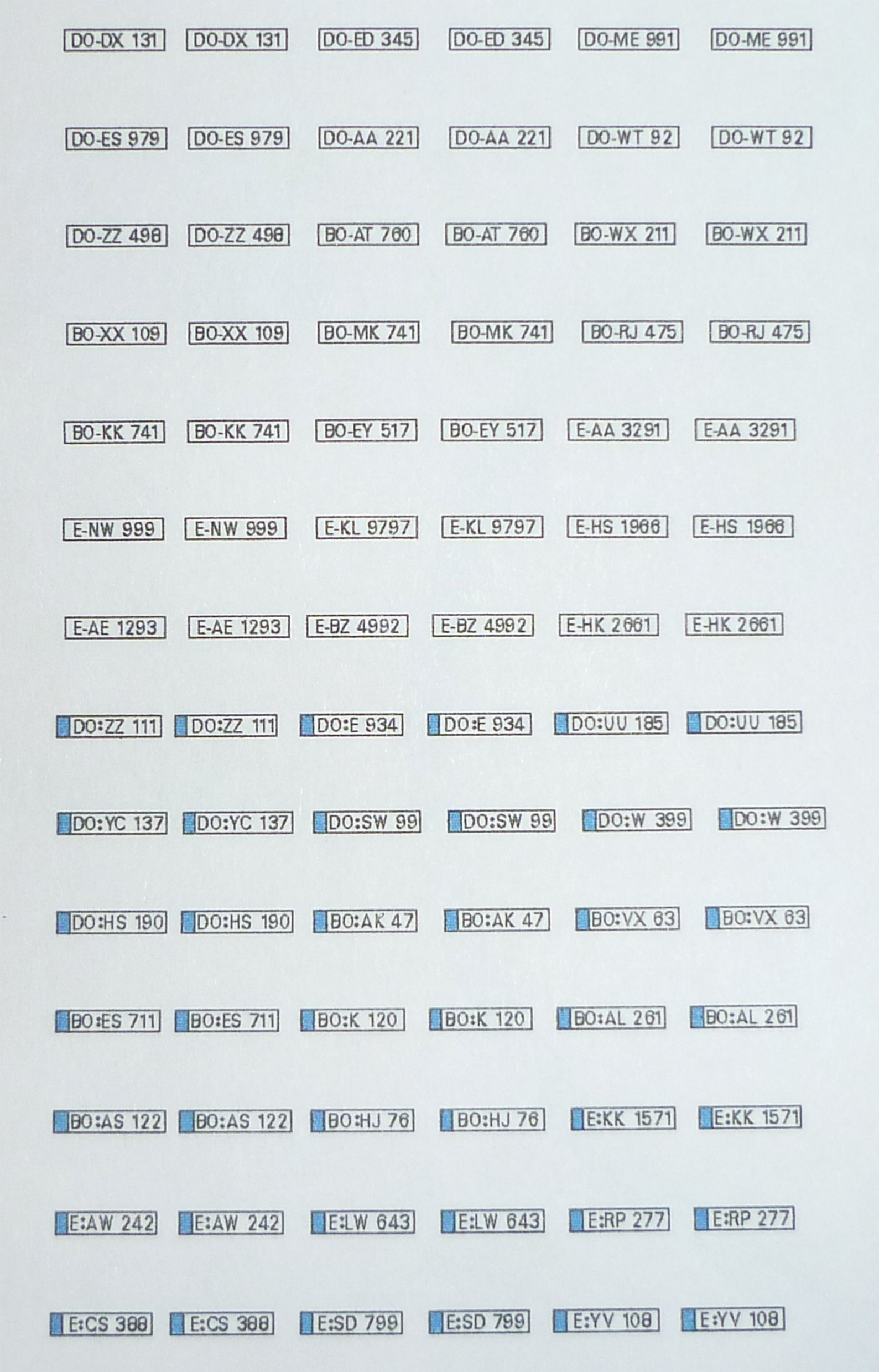 Decalsatz KFZ-Kennzeichen Bundesrepublik Deutschland + Eurokennzeichen Dortmund, Bochum und Essen 1:87 Spur H0